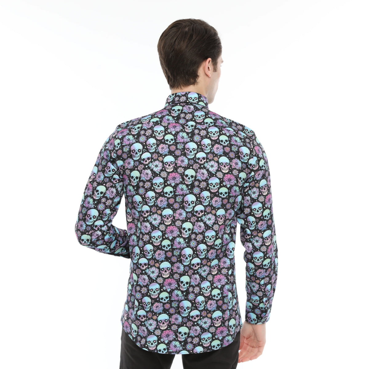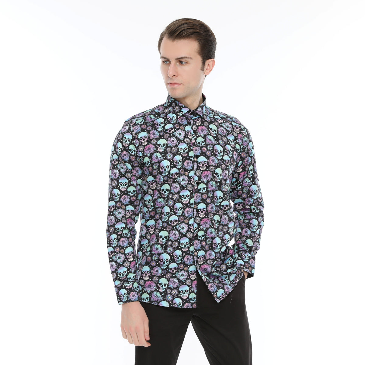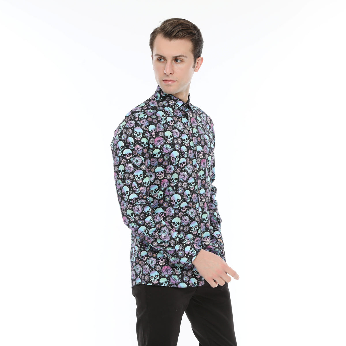Xact Men's Holographic Skulls & Flower Print Long Sleeved Shirt, Regular Fit
