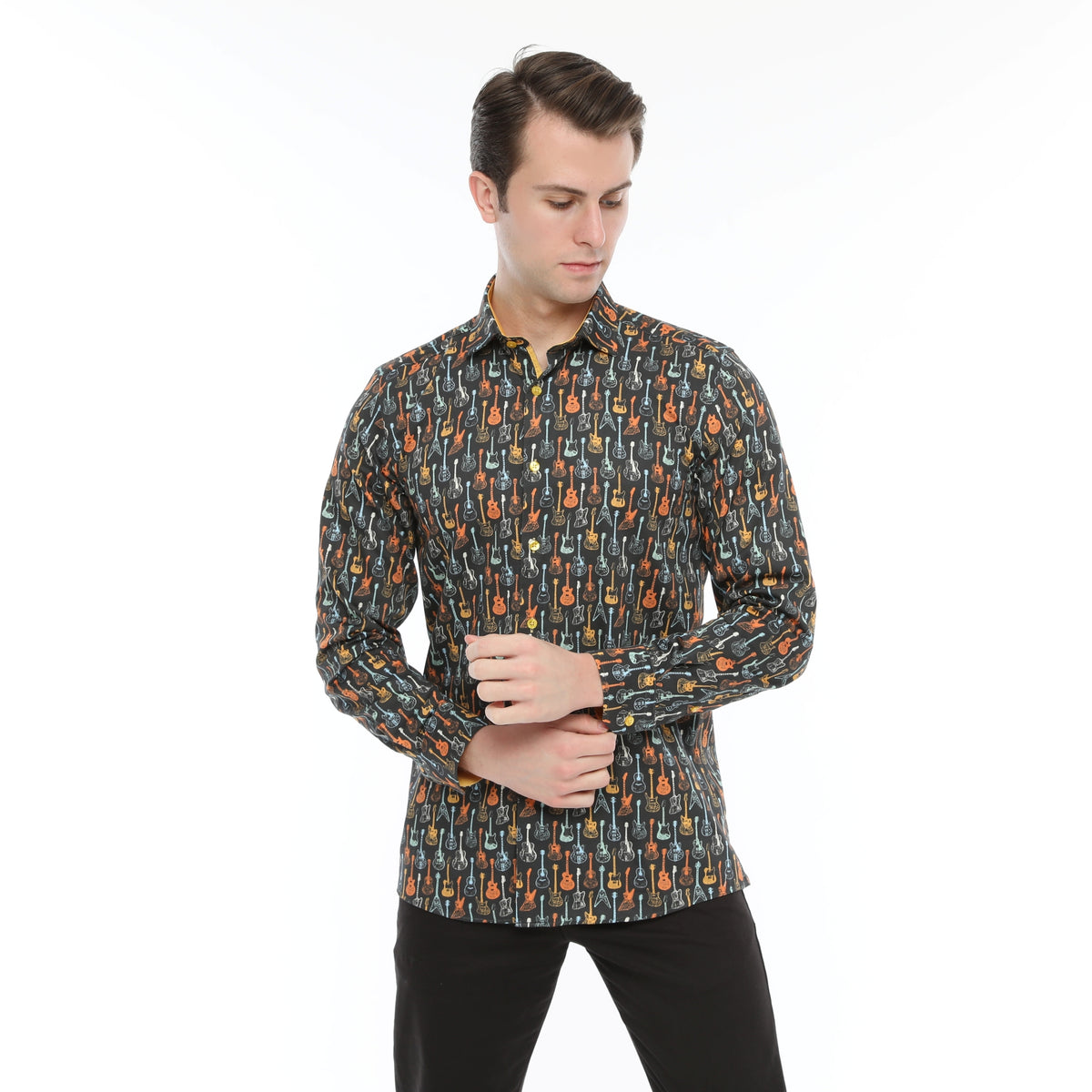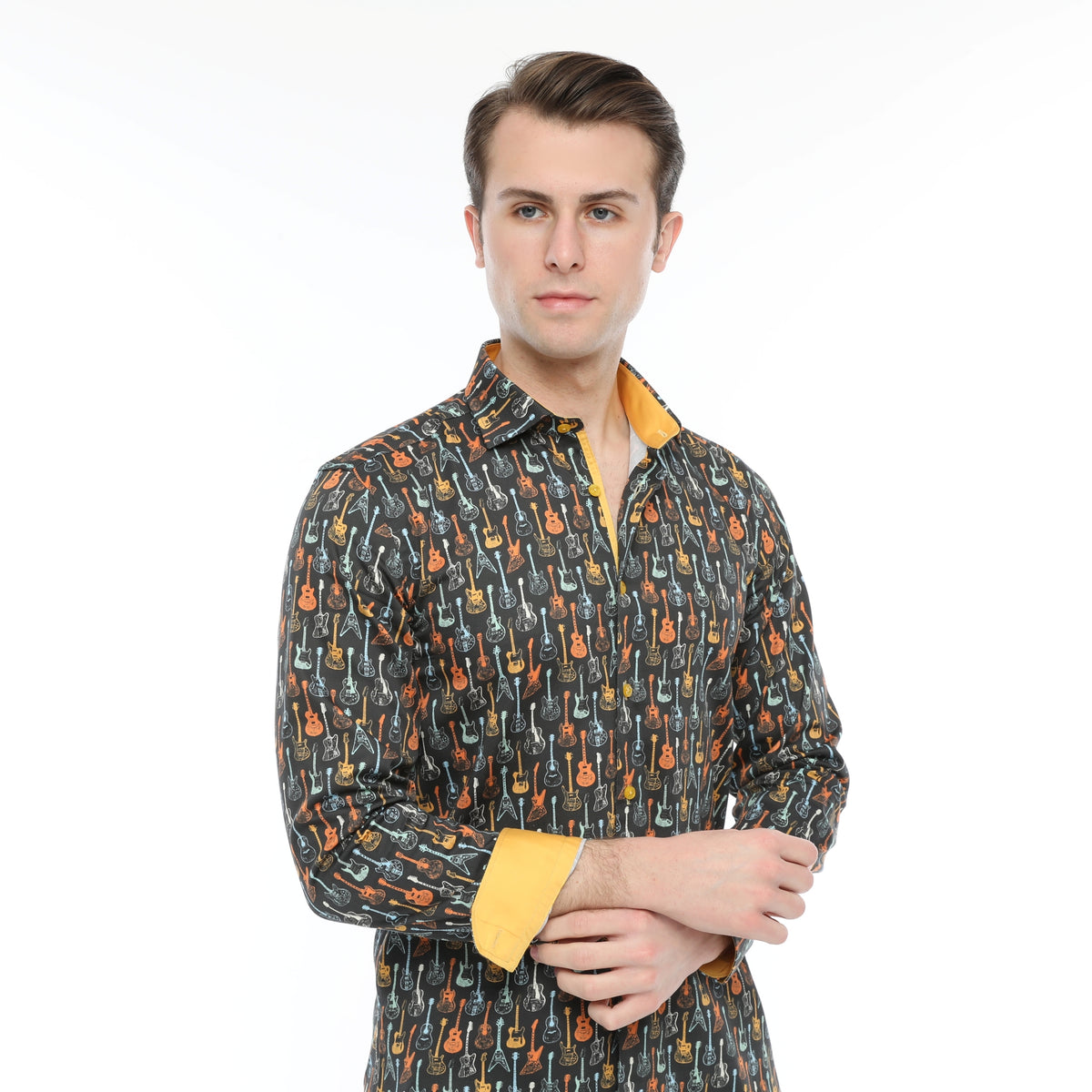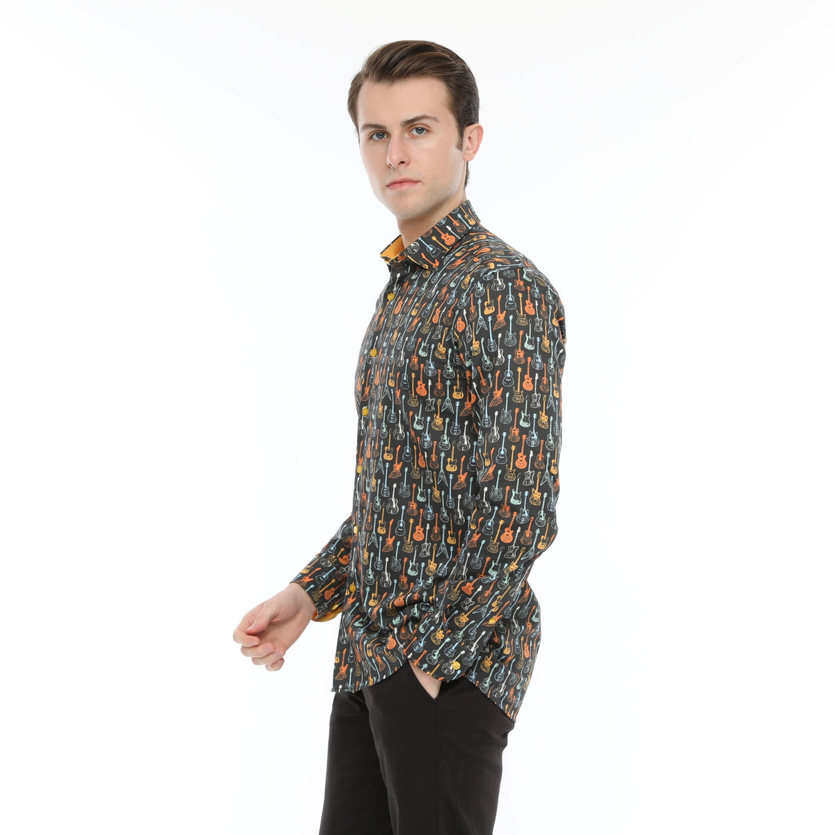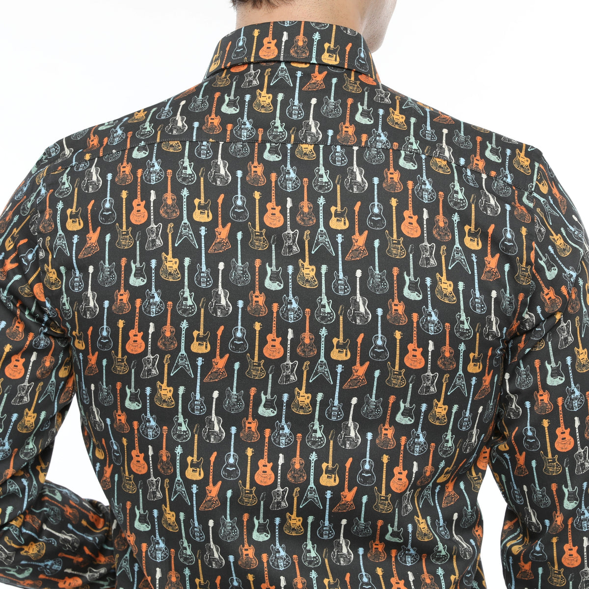 60's Inspired Guitar Print: Retro colors blend on this shirt featuring acoustic and electric guitars for a vibrant, music-inspired statement